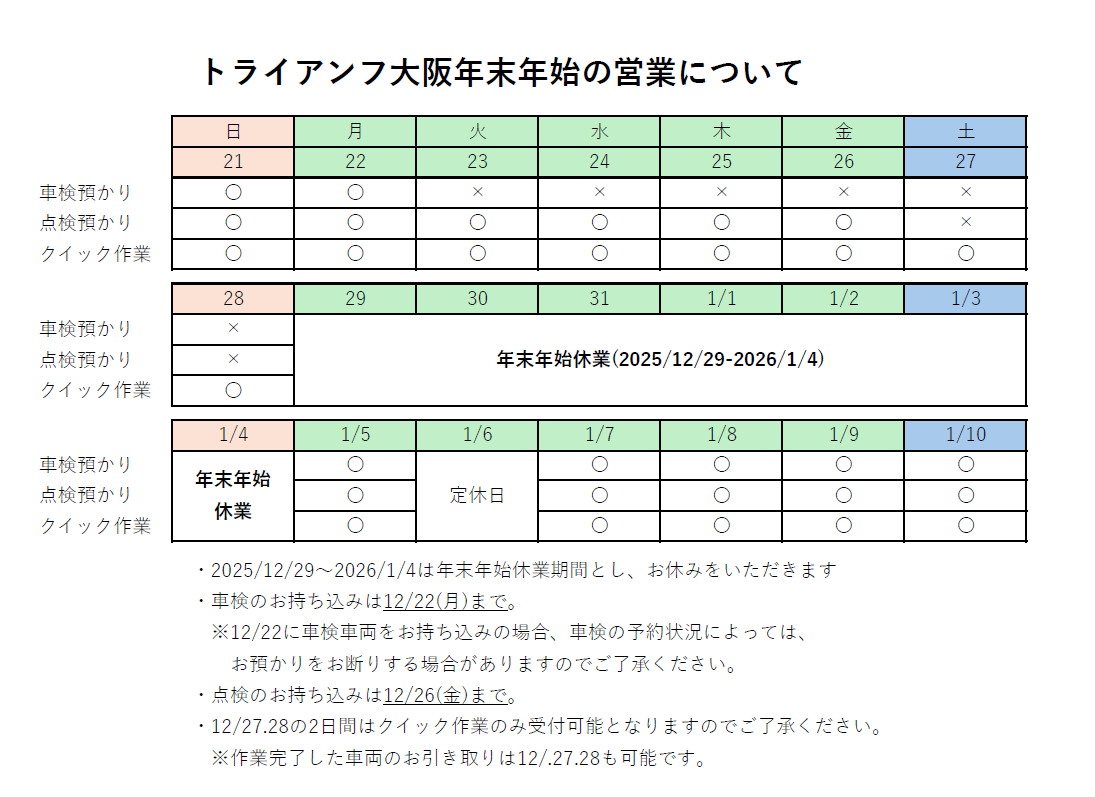 トライアンフ大阪は2025年12月29日~2026年1月4日を年末年始休業としてお休みを頂戴いたします。